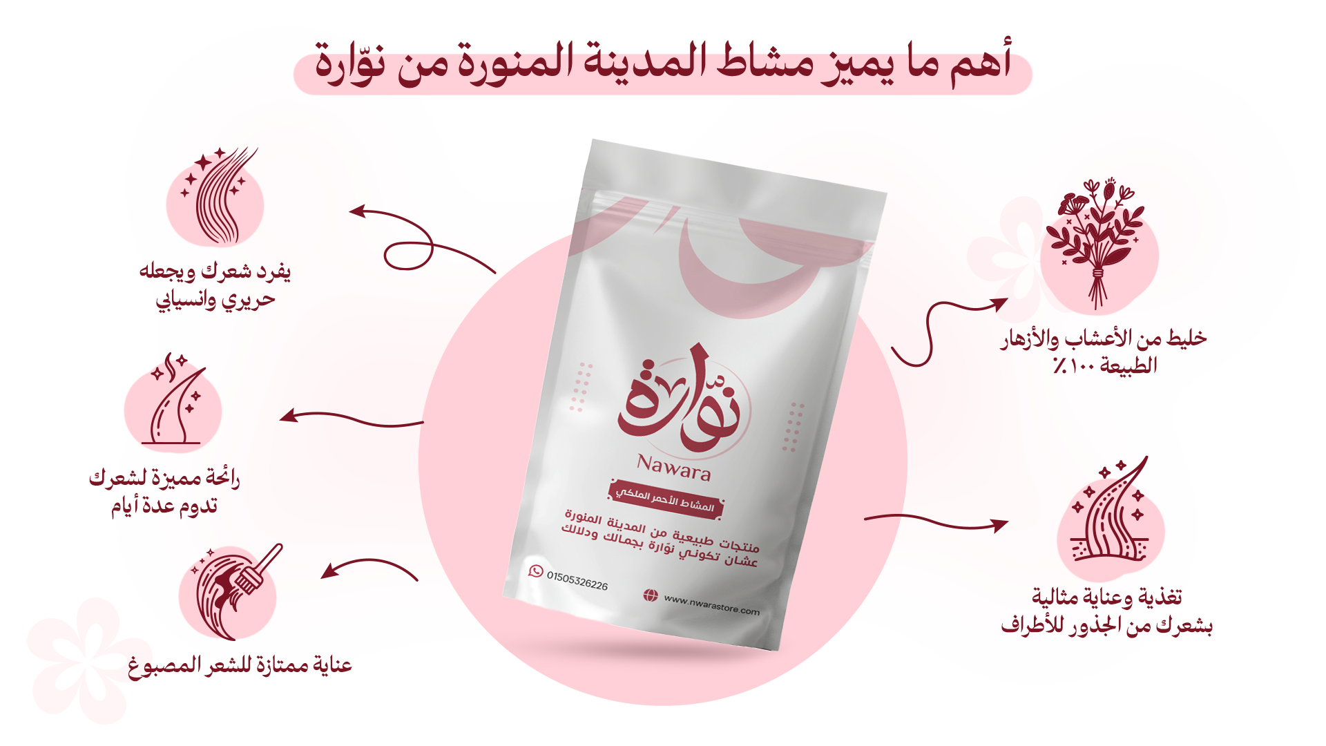 المشاط الأحمر الملكي من نوارة 200 جم؛ خليط أعشاب من المدينة المنورة (ورد، كركديه، لافندر، إكليل الجبل). يقوي الشعر، يرطّبه، ينقّي فروة الرأس ويمنح رائحة تدوم.